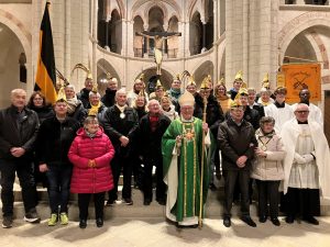 ihrer Vereinszugehörigkeit trugen die Karnevalisten auch im Gotteshaus ihre Narrenkappen und konnten so die bischöfliche Mitra am Altar mit ihren Kopfbedeckungen in den Kirchenbänken spiegeln. Auch Vereinsstandarte und Kolpingbanner